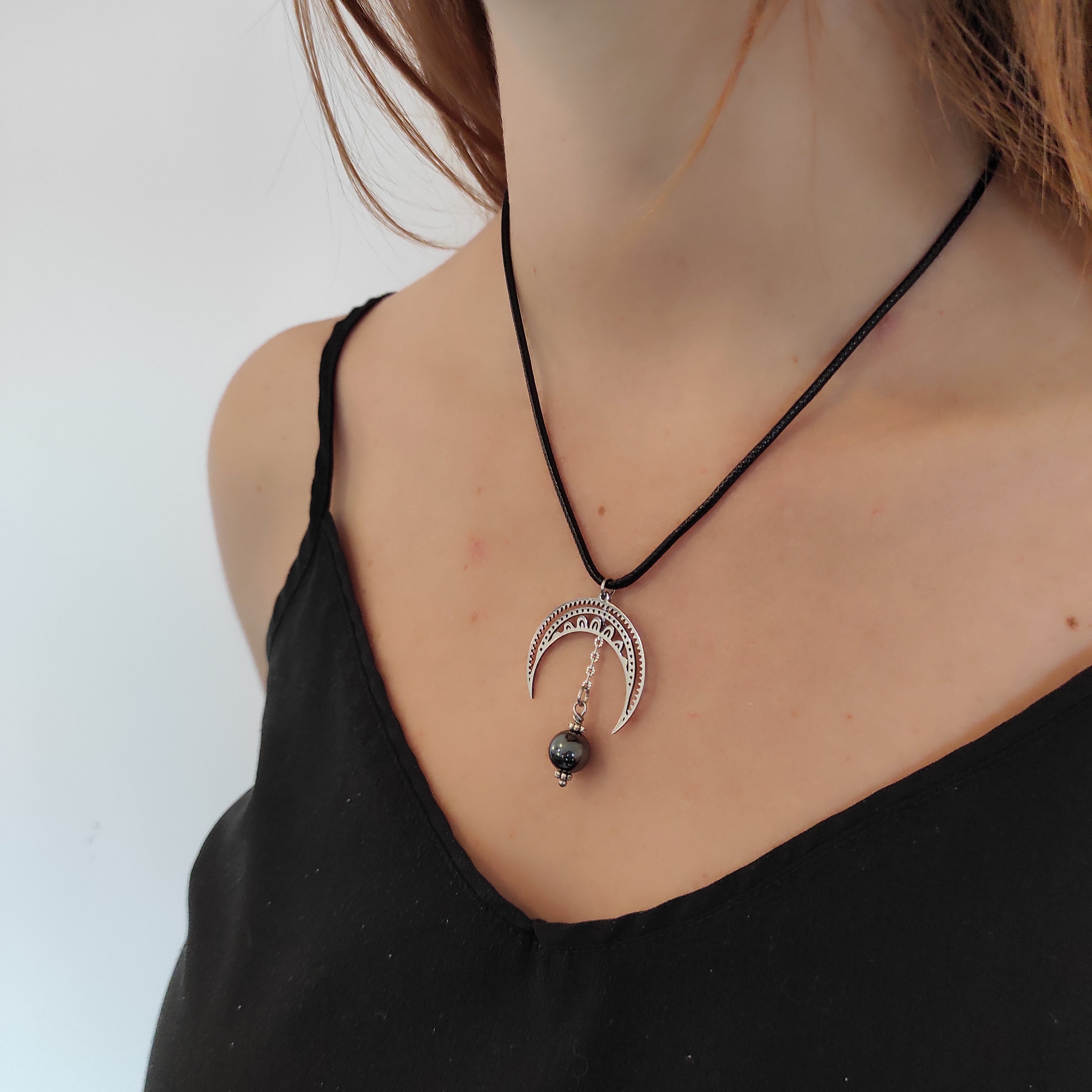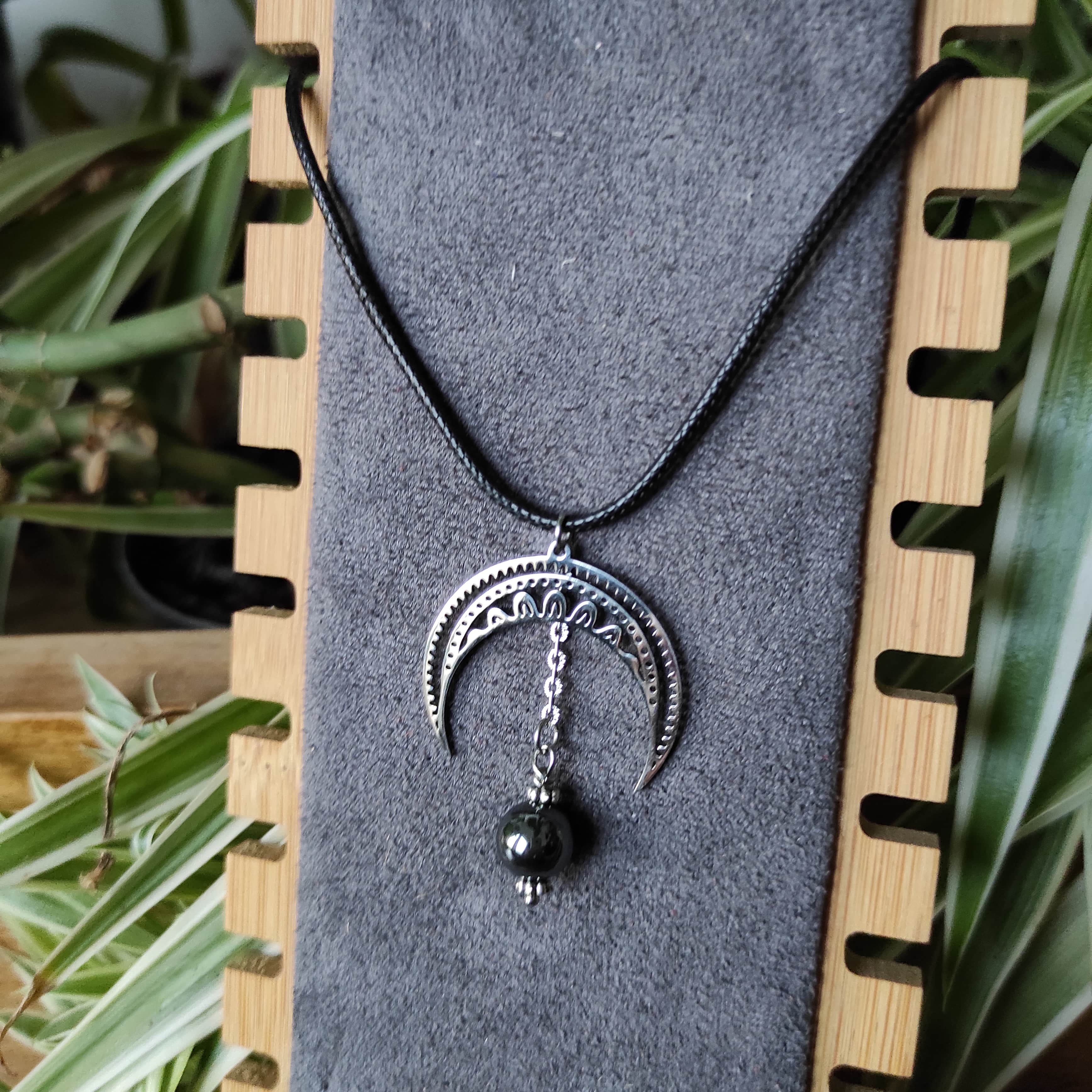 Collier Lune/Pierre et Cordon noir